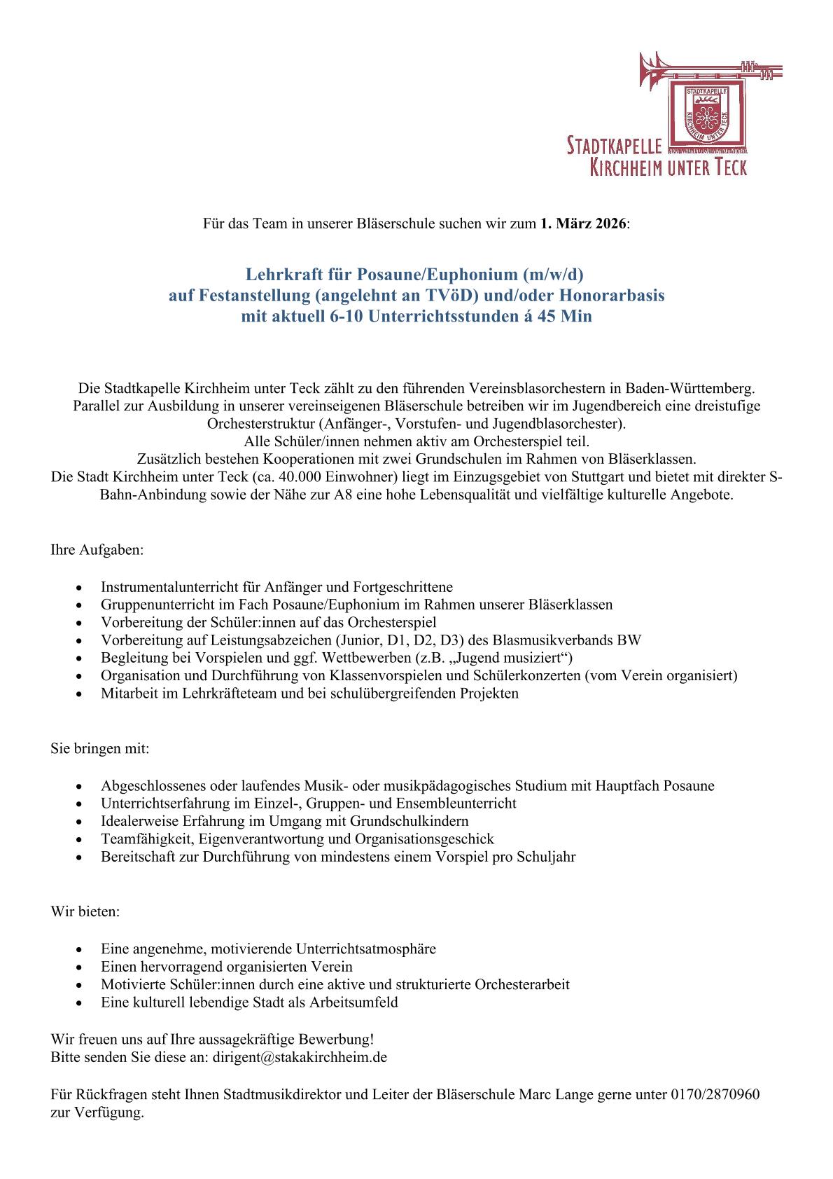 Die Heimat der Stadtkapelle Kirchheim unter Teck ist eine Stadt in Baden-Württemberg, im Südosten der Region Stuttgart etwa 25 km südöstlich von Stuttgart, kurz vor dem Aufstieg zur Schwäbischen Alb. Die große Kreisstadt Kirchheim unter Teck zählt an die 40.000 Einwohner. Sie ist die viertgrößte Stadt des Landkreises Esslingen und bildet ein Mittelzentrum für die umliegenden Gemeinden. Cirka 180 aktive Mitglieder musizieren im Anfänger-, Vorstufen-, Jugend-, und dem großem Blasorchester der Stadtkapelle. Im Vordergrund der musikalischen Arbeit von Stadtmusikdirektor Harry D. Bath stand die sinfonische Blasmusik. Seit 1974 führte er die Stadtkapelle Kirchheim unter Teck kontinuierlich an der Spitze der Vereinsblasorchester in Deutschland. Nach seiner Verabschiedung in den Ruhestand hat seit April 2012, Marc Lange die künstlerische Gesamtleitung der Stadtkapelle Kirchheim unter Teck übernommen.