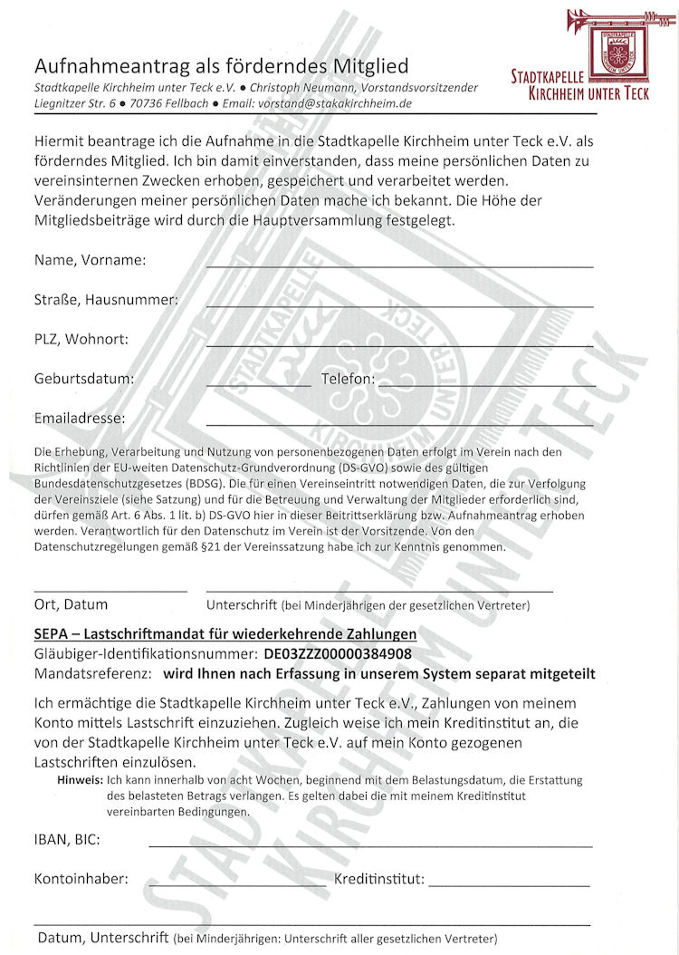 Neben der Möglichkeit, sich als aktives Mitglied in einem der Orchester musikalisch zu betätigen, haben Sie die auch Möglichkeit, die Stadtkapelle Kirchheim als Fördermitglied zu unterstützen.
