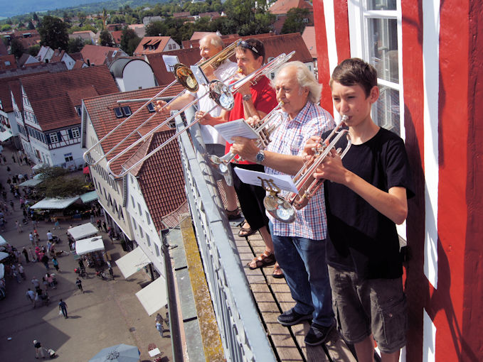 Vier Turmbläser beim Musizieren auf dem RathausturmGeschichte schreibt Musik. Die Turmbläser in Kirchheim unter Teck werden in diesem Jahr 500 Jahre alt. Das muss gefeiert werden – auf besondere Weise. Die Stadtkapelle Kirchheim unter Teck und die Stadtverwaltung Kirchheim haben eine musikalisch-historische Entdeckungsreise entwickelt. Die Orte Kirchheims, die Musikgeschichte geschrieben haben, werden mit den Stadtführerinnen und Stadtführern besucht. Kleine Ensembles der Stadtkapelle haben für die Orte eigene kreative Arrangements entwickelt. Und die Teckstadt hat einen eigenen Klang. Sei es die spannende Geschichte der Pianofabrik Kaim, die zahlreichen Beiträge der Kirchenmusik zur musikalischen Entwicklung unserer Stadt und natürlich auch die neuartigen Impulse, die vom Club Bastion ausgingen. Die Teilnehmerinnen und Teilnehmer erwartet eine wunderbare Stadtführung für die Ohren.