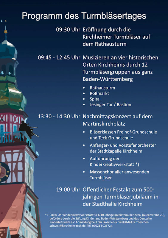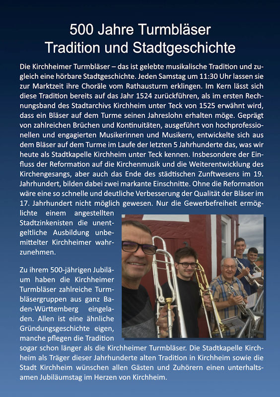 Die Stadtkapelle Kirchheim als Träger dieser Jahrhunderte alten Tradition in Kirchheim, sowie die Stadt Kirchheim unter Teck wünschen allen Gästen und Zuhörern einen unterhaltsamen Jubiläumstag im Herzen von Kirchheim.