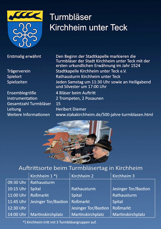 Dieses 500-jährige Jubiläum wird am Sa. 20.07.2024 mit einem großen Turmbläsertag in ganz Kirchheim gefeiert. Dazu wurden 12 Turmbläsergruppen aus Baden-Württemberg eingeladen. Laut eigenen Recherchen, kamen deutschlandweit noch nie so viele Turmbläsergruppen für eine Veranstaltung zusammen. Allen ist eine ähnliche Gründungsgeschichte eigen, manche pflegen die Tradition sogar schon länger als die Kirchheimer Turmbläser.