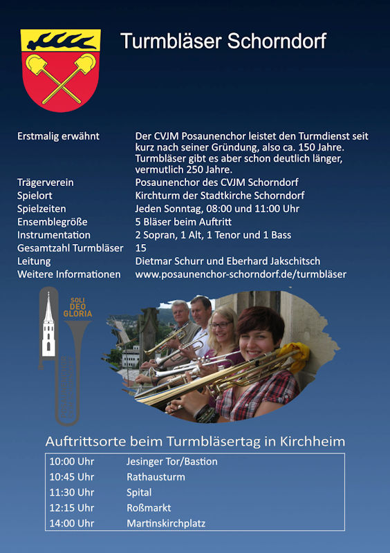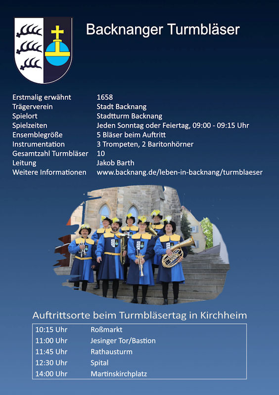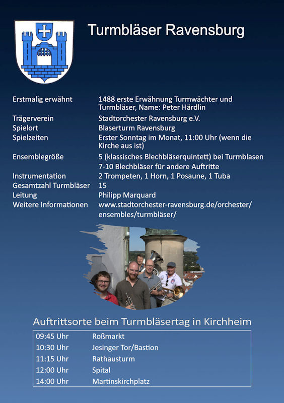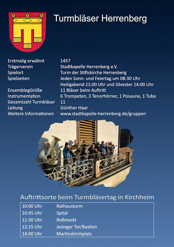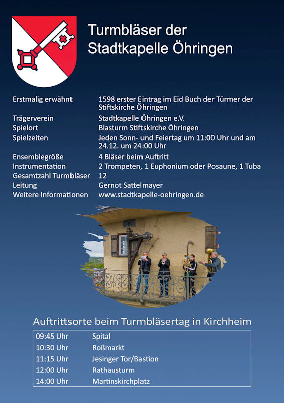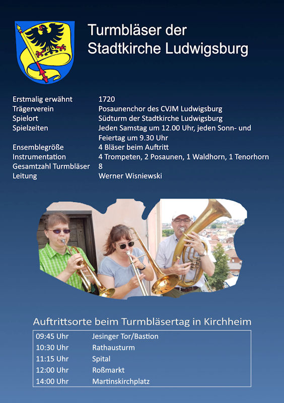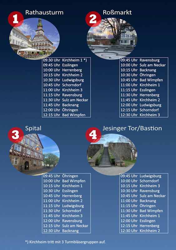 Zwischen 09:30 Uhr und 12:30 Uhr werden Turmbläser-Ensembles aus anderen Städten unseres schönen Bundeslandes an verschiedenen Orten in der Kirchheimer Altstadt spielen. - Samstag 20.07.2024 13:30 - 15:00 Uhr Massenchor der Turmbläser auf dem Martinskirchplatz