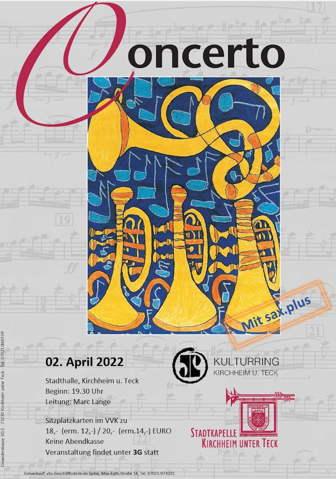 Programmvorschau zum Concerto der Stadtkapelle Kirchheim in Kooperation mit dem VHS-Kulturring Kirchheim unter Teck am Samstag, den 02.04.2022 um 19:30 Uhr in der Stadthalle