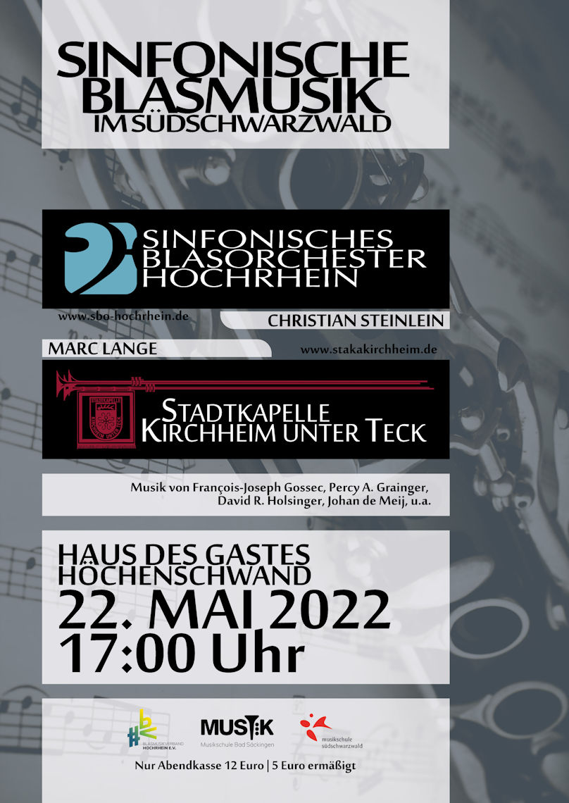 Am 22. Mai findet um 17.00 Uhr im Haus des Gastes in Höchenschwand ein Doppelkonzert mit der Stadtkapelle Kirchheim unter Teck unter der Leitung von Marc Lange und dem Sinfonischen Blasorchester Hochrhein unter der Leitung von Christian Steinlein statt. Auf dem Programm stehen Werke von Francois-Joseph Gosec (Symphonie pour Musique - Militaire), Percy Grainger (Lincolnshire Posy), Johan de Meij (The Wind in the Willows) und anderen.